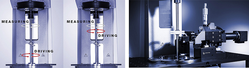 在反向運動模式下,流變儀将兩套空氣軸承 EC 馬達均用(yòng)作(zuò)驅動裝(zhuāng)置和扭矩傳感器。兩個馬達可(kě)以輕松設置為(wèi)以相反方向旋轉,這可(kě)以用(yòng)來在測量樣品中(zhōng)形成固定的停滞面,以便采用(yòng)顯微鏡進行剪切條件下材料的先進結構分(fēn)析。此模式也可(kě)以與通用(yòng)拉伸夾具(jù)結合使用(yòng),以便在最小(xiǎo)的測量扭矩下進行拉伸測量。就速度而言,反向運動模式更讓測量工(gōng)作(zuò)“事半功倍” — 最高速度差高達 6000 rpm,這大大拓寬了高剪切應用(yòng)的剪切速率範圍。